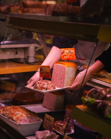 Dans sa boutique, on peut d'ailleurs admirer presque plus de trophées que de produits et de charcuterie ! Patrick arbore aussi le drapeau européen sur son col, après avoir fini 1er d’un concours international pour son saumon et son foie gras.